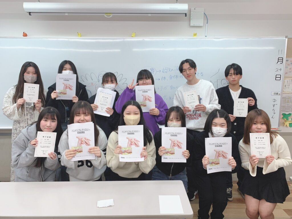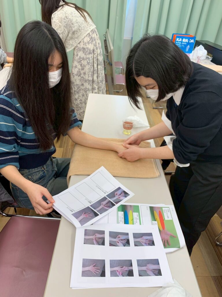 この日は、東京未来大学福祉保育専門学校で、ベビーマッサージ初級講座(担当:三尾麻理子先生)とハンドリフレクソロジー初級講座(担当:遠藤洋子先生)を開催させていただきました!